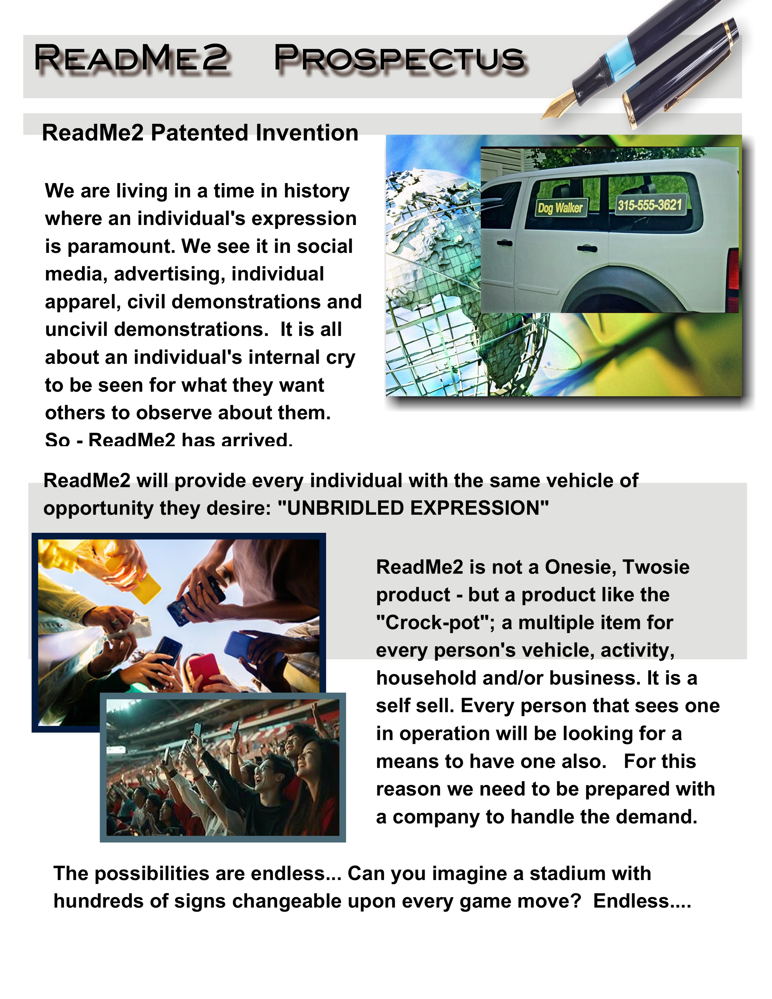 The following is a fundamental Prospectus for ReadMe2 factoring an initial 50 million units. The initial 50 million units are conservatively being projected from data showing an excess of 300 million registered passenger vehicles and the excess of 300 million individuals in the USA alone. Therefore estimating the 50 million initial units as only the "tip of the iceberg".